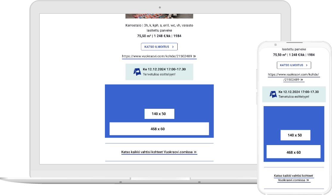 Kohdesivun mainospaikka sijaitsee Etuovi.comissa juuri ennen yhteydenottolomaketta ja Vuokraovi.comissa heti esittelyajan jälkeen. Näin näkyvyys on molemmissa palveluissa keskiössä potentiaalisille asunnonvaihtajille. Millaisen sanoman haluat tuoda esiin yhteydenottoaikeissa olevalle henkilölle?