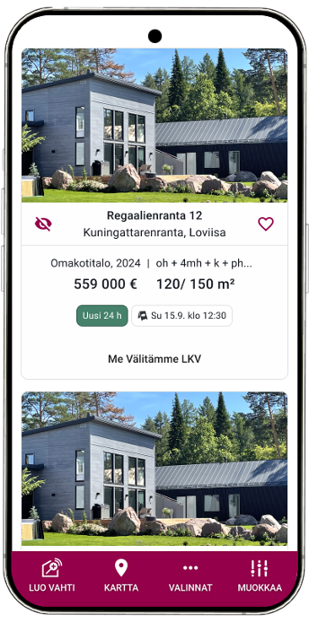 – 1 pieni kuva ja kohdekortti myytävästä kohteesta hakutulossivulla